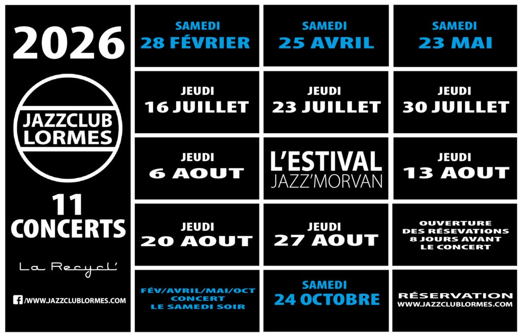 En 2026, le Jazz Club Lormes va célébrer ses 10 ans avec 11 concerts de février à octobre : 4 concerts hors-saison en février, avril, mai, octobre, le samedi soir. L’Estival Jazz’Morvan 2026, ce sera 7 concerts pendant l’été avec un concert chaque jeudi du 10 juillet au 27 août.